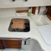 • Compact galley with a single-burner stove, sink, and a small icebox or refrigerator.